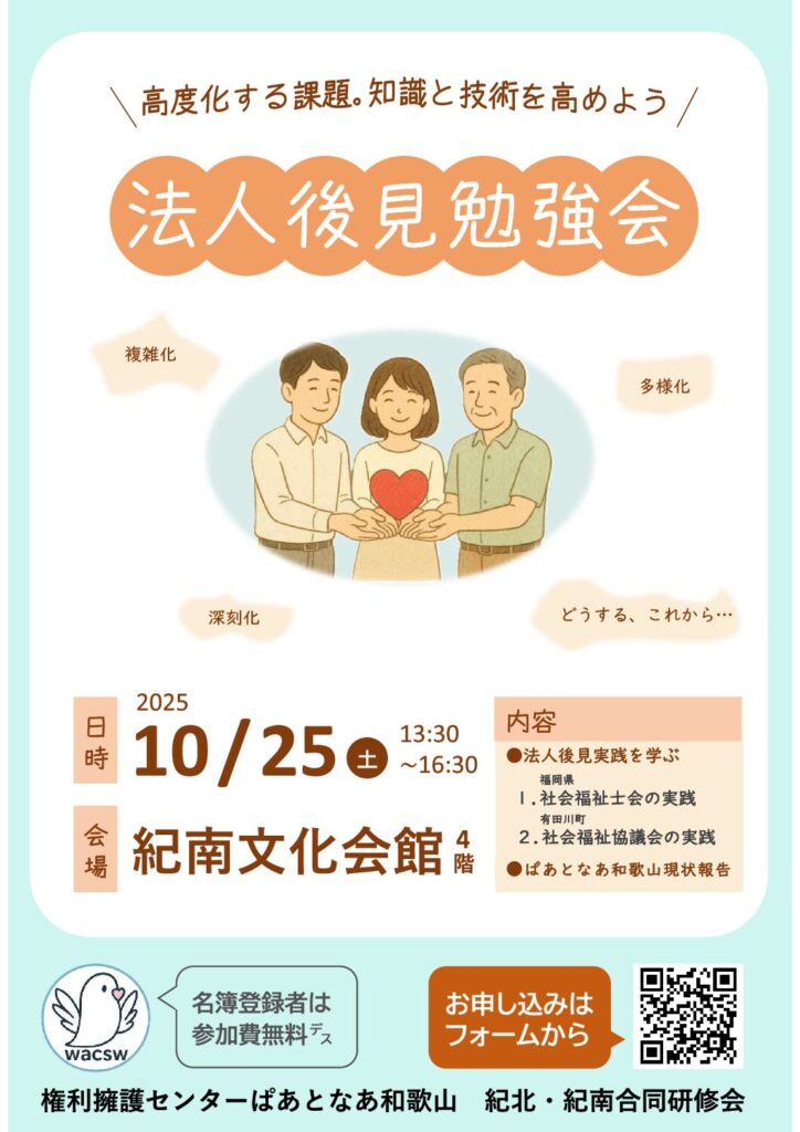 「権利擁護センターぱあとなあ和歌山」では名簿登録者の皆様の交流とキャリアアップを目的として、名簿登録者の皆さま限定の情報交換会を紀北エリア、紀南エリアに分かれて開催します。特に現在、成年後見人を受任されている方は、是非ご参加くださいますようお願いいたします。
